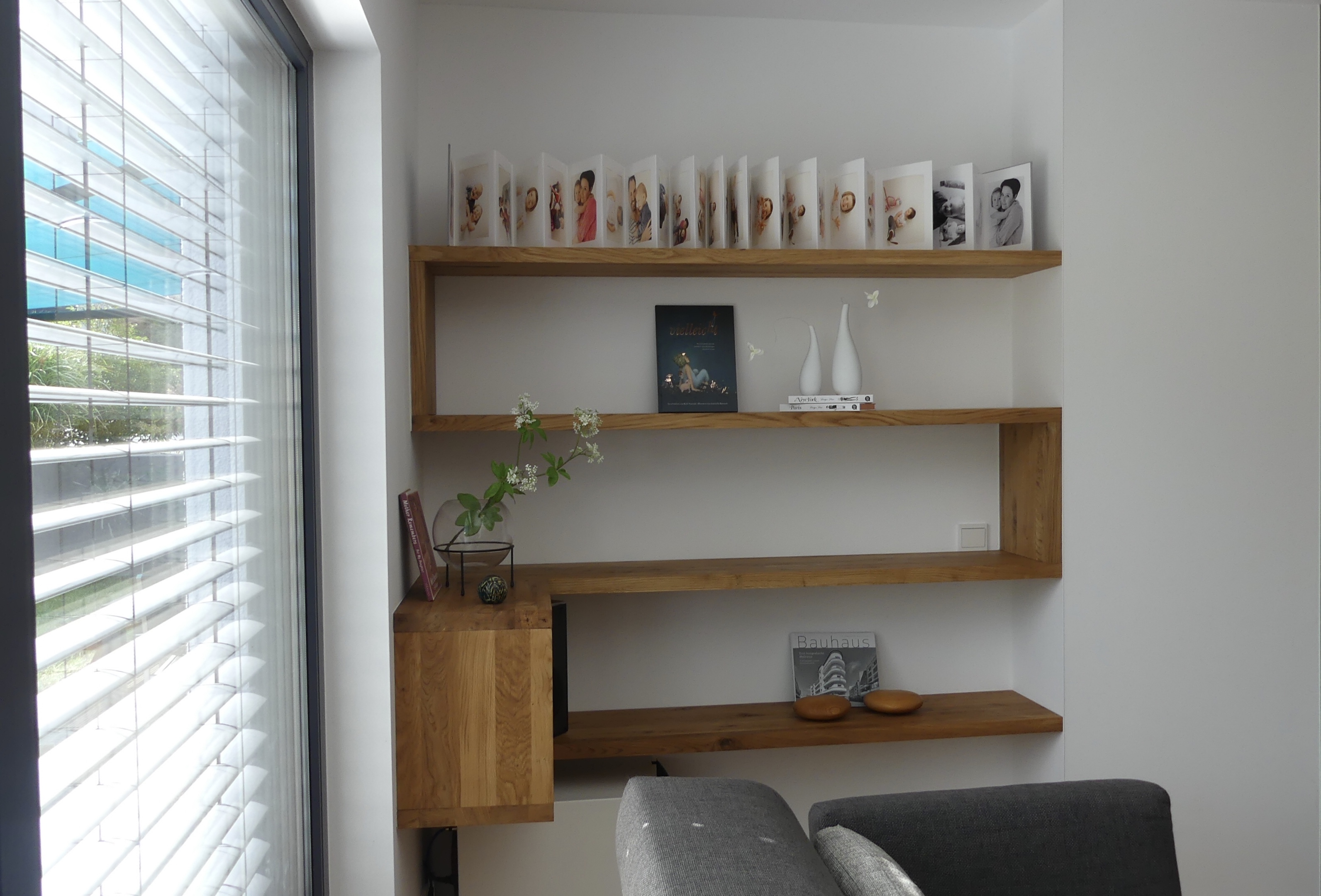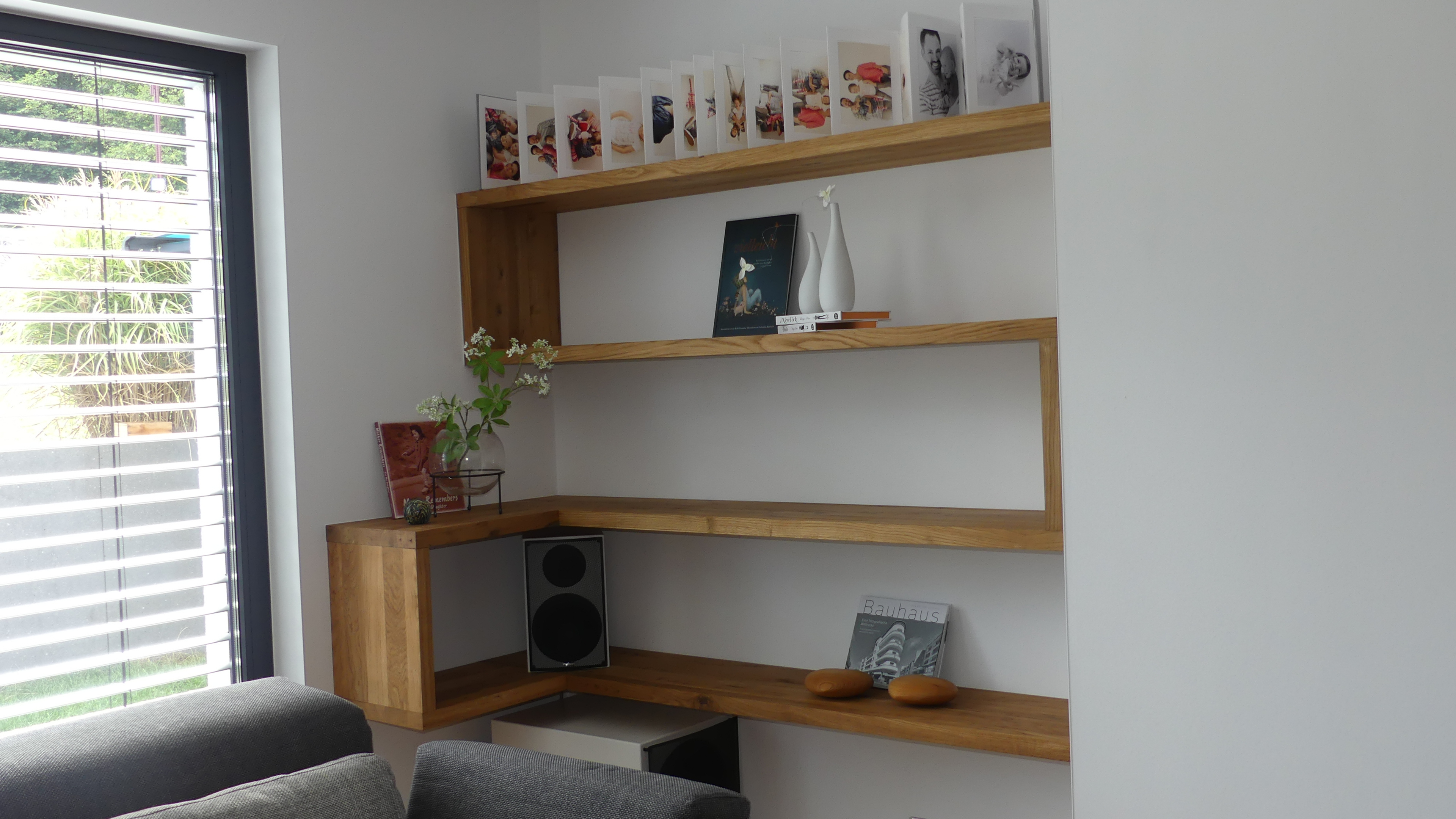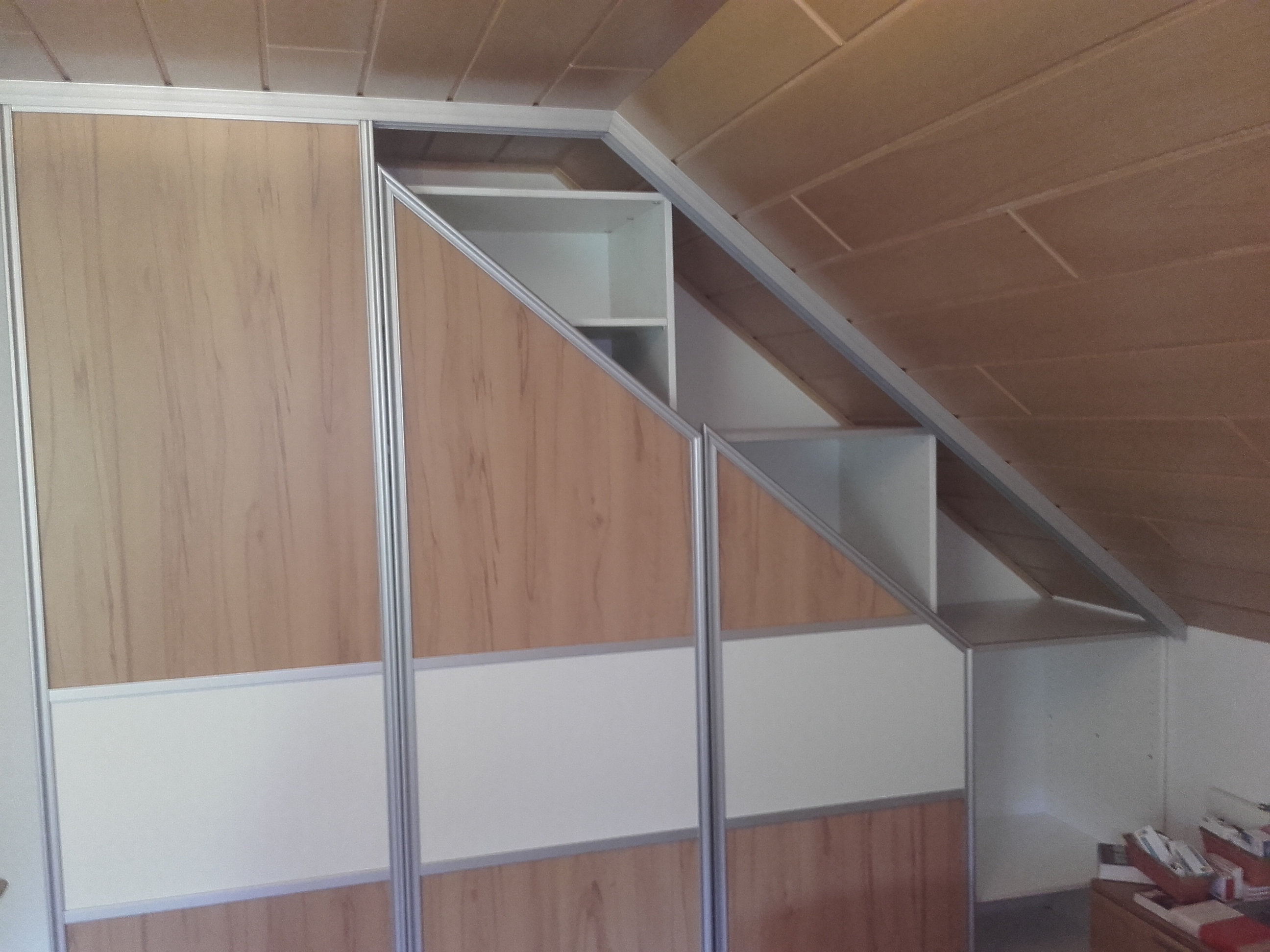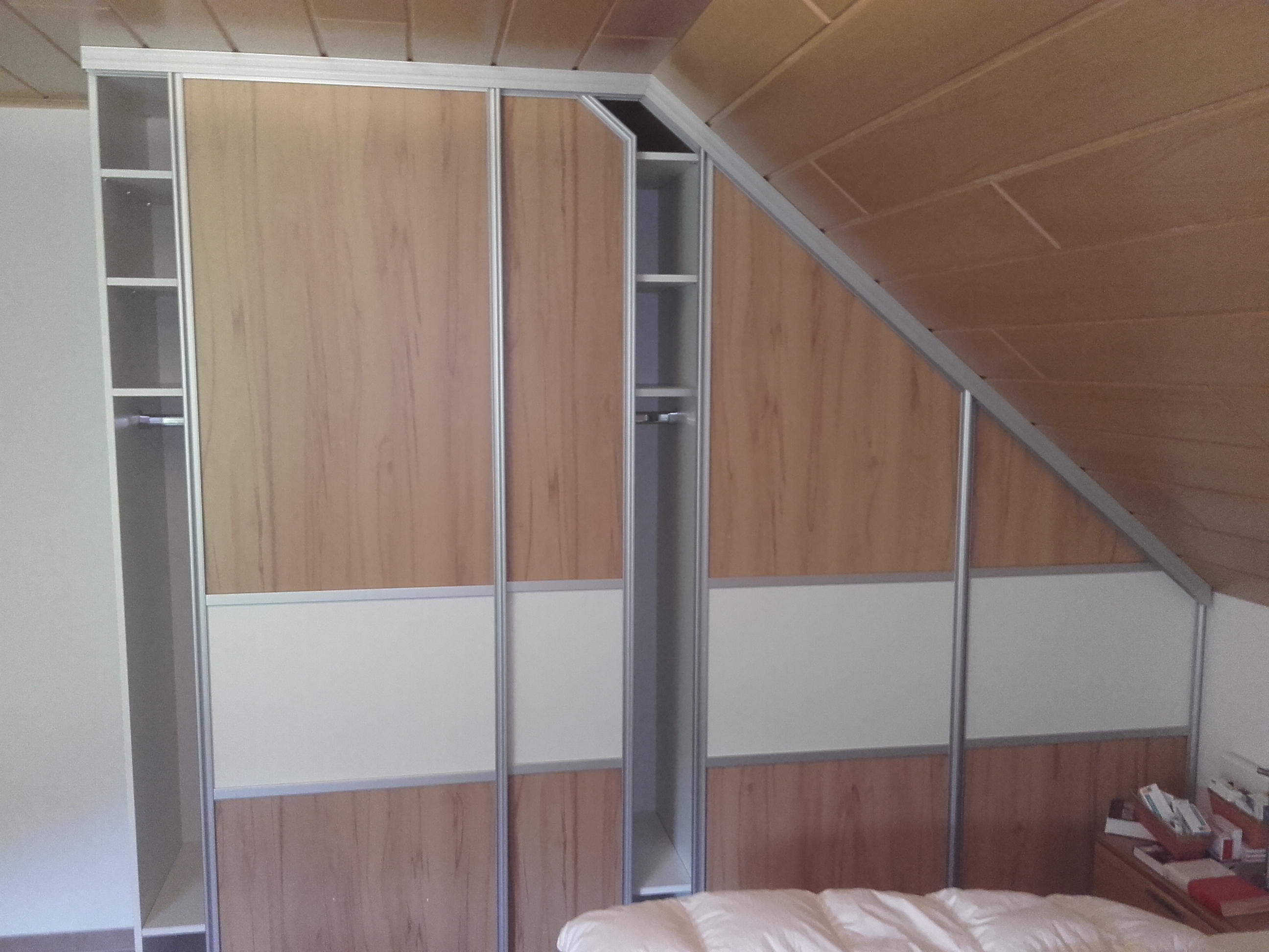 Einbauschrank in der Dachschräge mit Schiebetürfront. Kombination von Weißlack mit Kernbuche.