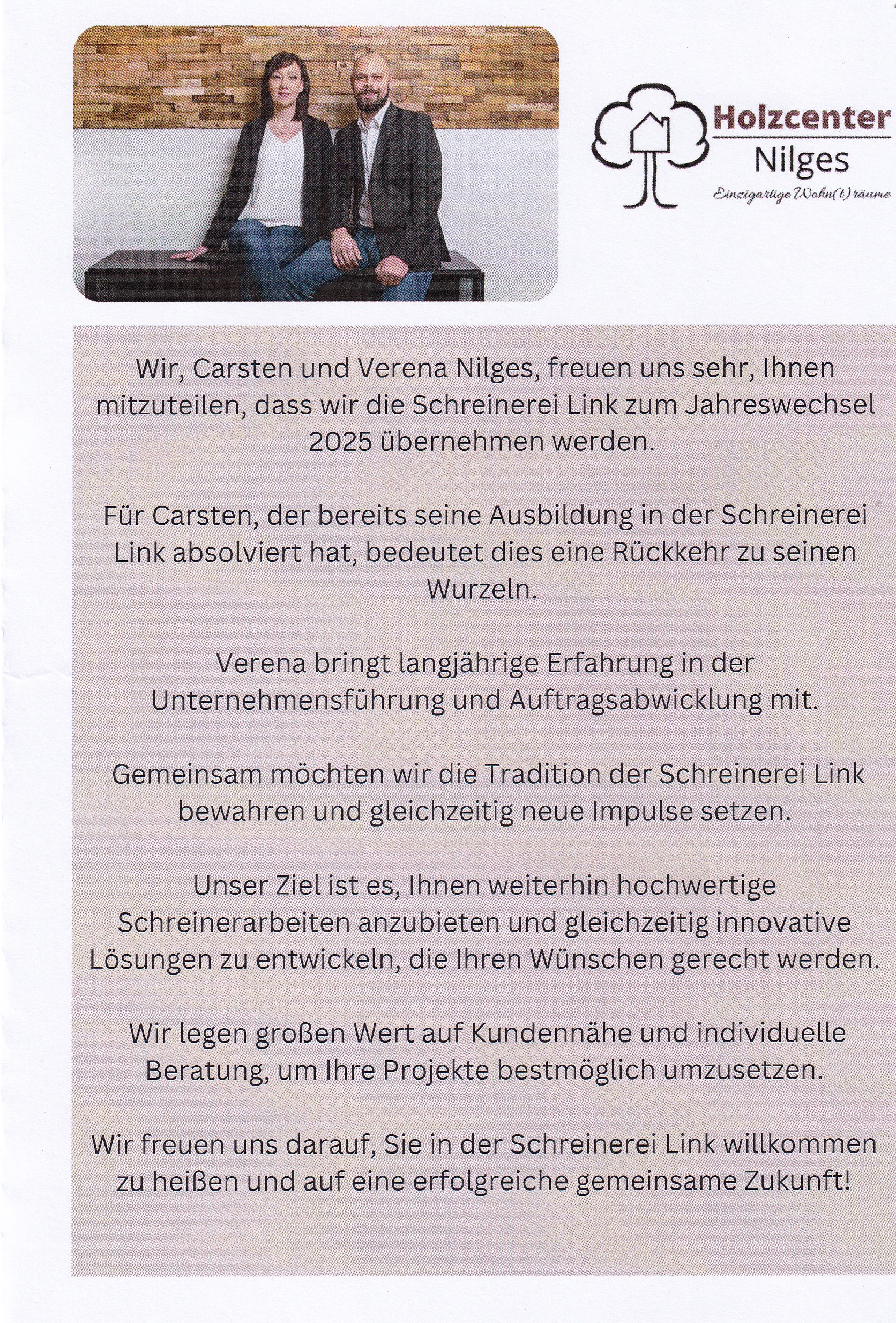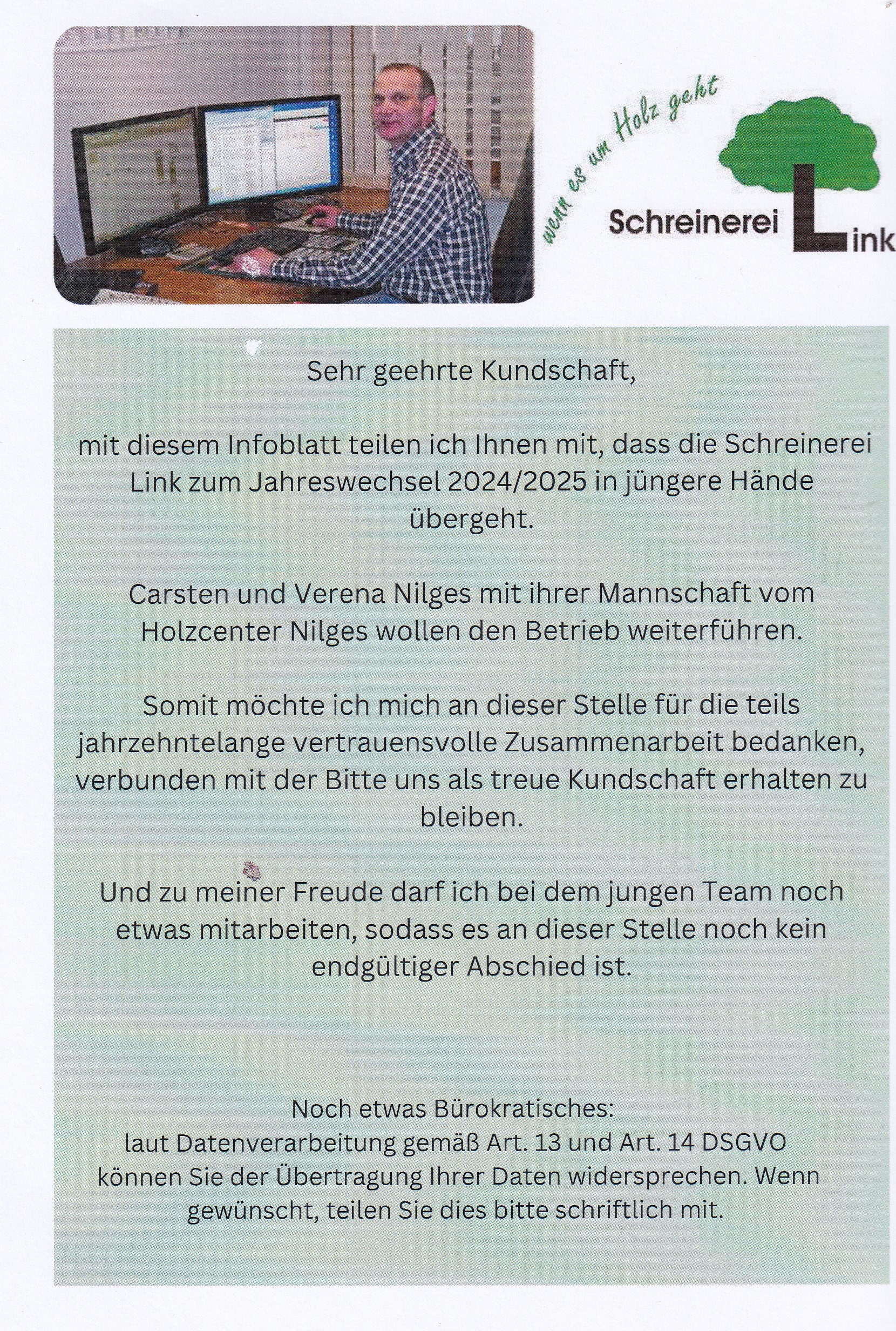 1966 übergab er die Schreinerei an seinen Sohn Hermann Link. Dieser hatte nach Lehre und Gesellenjahre 1955 in Köln die Meisterprüfung abgelegt. Er hat schon früh seinen Vater in allen Bereichen des Handwerkbetriebes unterstütz. Hermann Link konnte mit den langjährigen Mitarbeitern das Unternehmen erfolgreich weiterführen. Er investierte in neue Maschinen um den Anforderungen, auch von immer neuen Materialien gerecht zu werden.